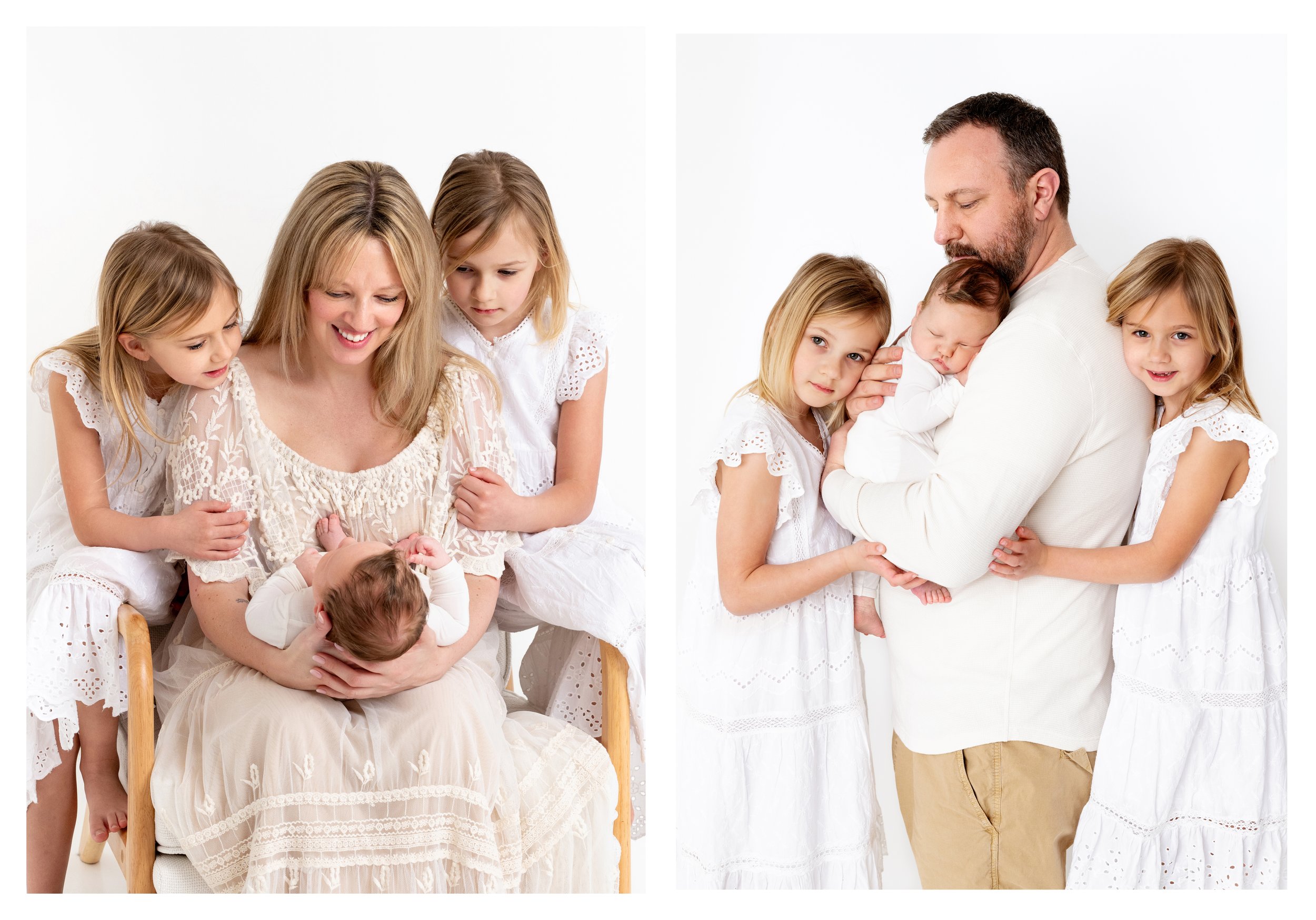 Mom holding newborn on a chair with sisters looking on. Dad holding newborn with sister snuggling them.